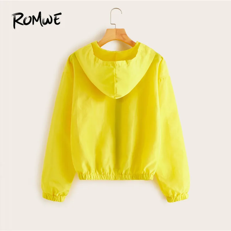 Romwe Sport Yellow Zip Up Drop Shoulder Windbreak Hooded Jacket Women Fall 2019 Clothes Female Running Jacket Fitness Activewear